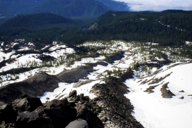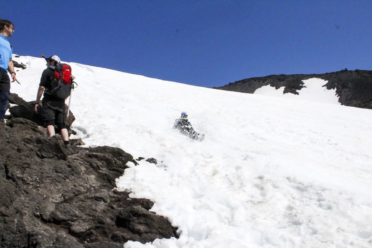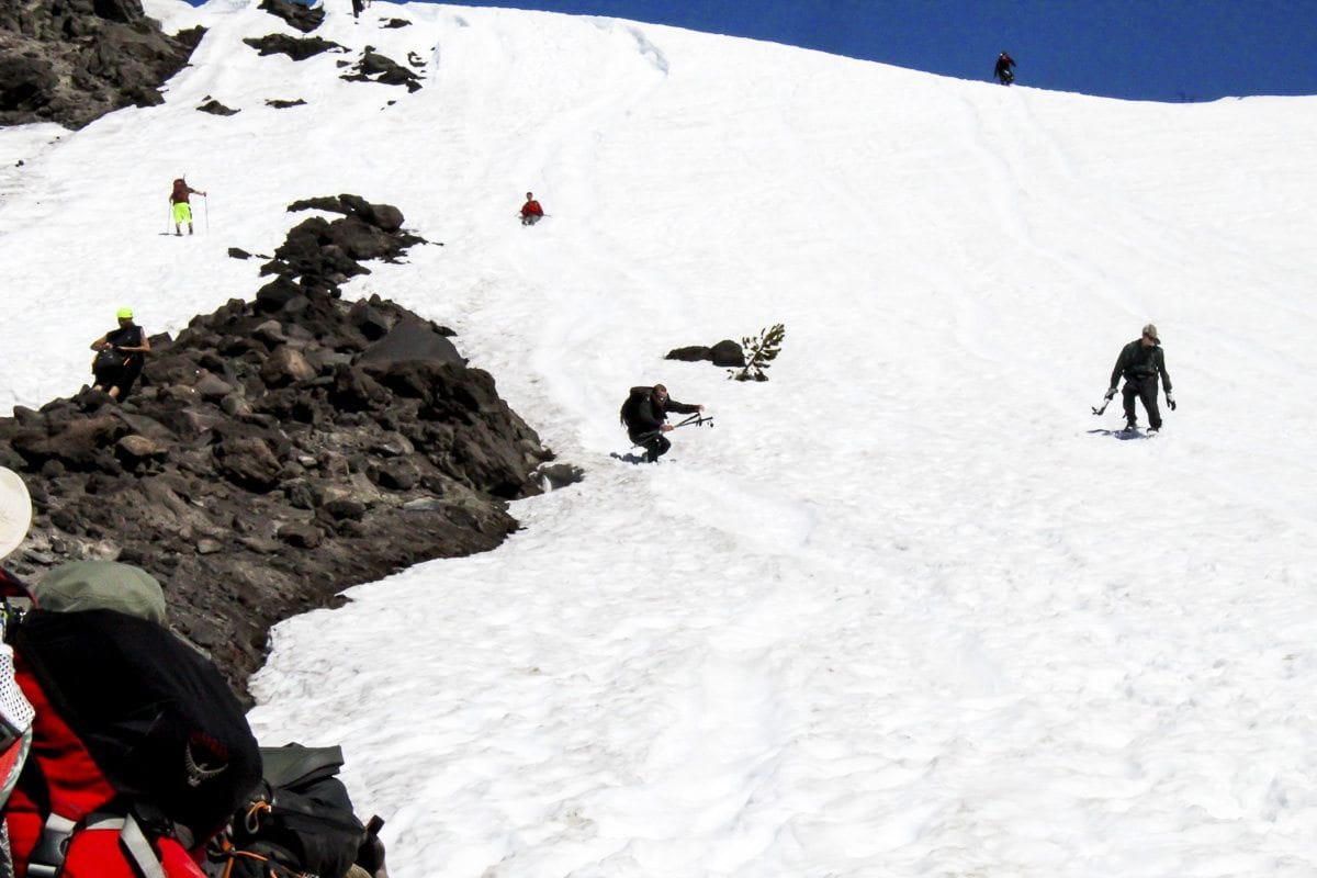 She was glissading down the southern flank after successfully reaching the summit, one of the many aspects and activities on the mountain I was unaware of and thus unprepared for. Glissading is the act of sliding down established chutes in the snow, whether seated on a trash bag or some other slick means of conveyance, and zooming down the mountainside like a backwoods bobsledder.