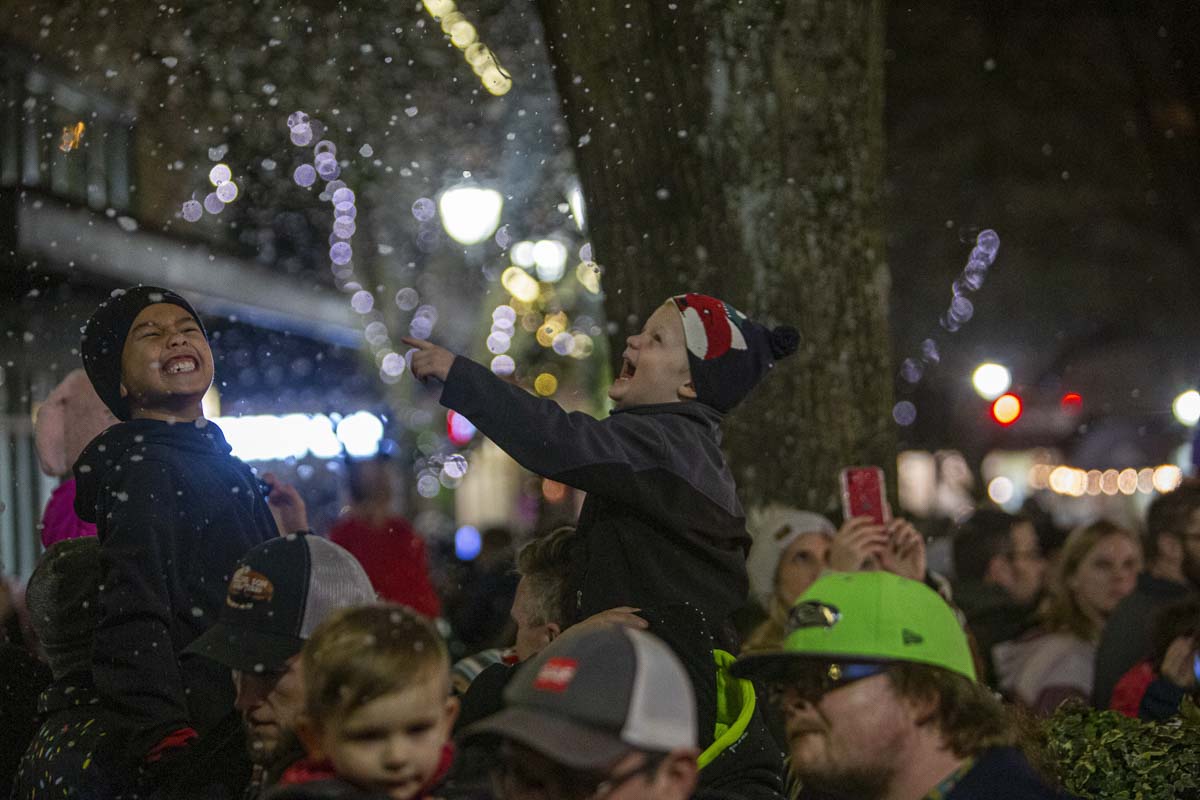 Children sit atop their parents’ shoulders as artificial snow rains down in a winter wonderland at the annual Camas Tree Lighting. Photo by Jacob Granneman This year’s Camas Christmas tree was set up with the help of Camas Public Works in cooperation with the historic Liberty Theater. Photo by Jacob GrannemanNewly elected Camas Mayor Barry McDonnell delivers his speech during the annual Camas Christmas tree lighting event downtown. Photo by Jacob GrannemanThe crowd was momentarily worried after the tree lit up early and then late, but all was well and the firework show to follow was a crowd pleaser. Photo by Jacob GrannemanChildren sit atop their parents’ shoulders during the annual Camas Tree Lighting. Hundreds of people packed main street for the event. Photo by Jacob Granneman