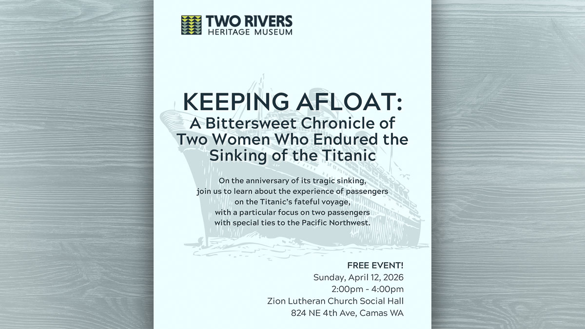 Area residents are invited to join an afternoon of storytelling on the anniversary of the tragic sinking of the Titanic. The Two Rivers Heritage Museum presents Peri Muchich, a local historian who has a particular passion for researching and shedding light on lesser known stories of remarkable individuals from the Pacific Northwest.