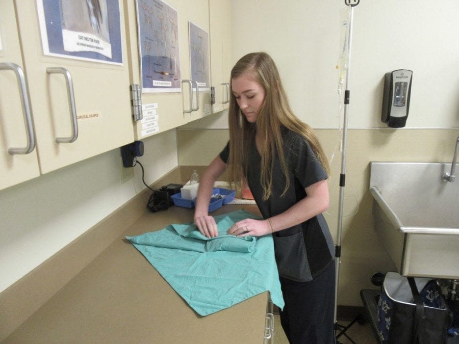 Stuchlik works as a surgery assistant, preparing and wrapping packs of instruments that will be used in surgery, cleaning intubation tubes, and washing surgical drapes. In the past she has also prepared the operating room, cared for animals coming out from under anesthesia, and given discharge instructions to owners.