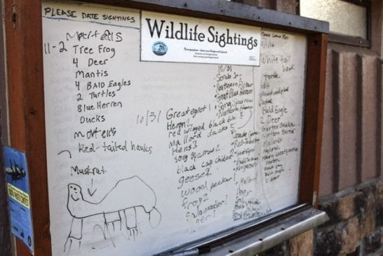 As you exit the refuge, visitors have recorded the various animals and birds they saw that day. On Wed., Nov. 2, visitors saw two tree frogs, four deer, four bald eagles, two turtles, a blue heron, ducks, red-tailed hawks and, as one child’s funny drawing pointed out, one muskrat.