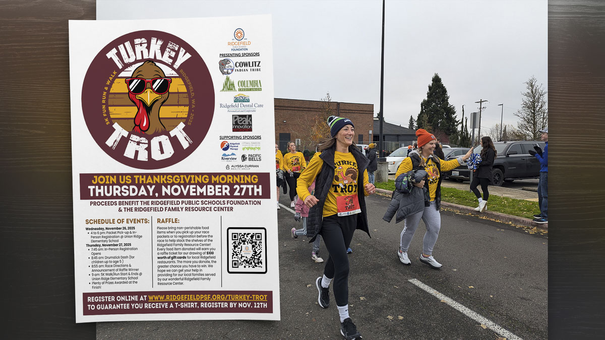 This year’s Turkey Trot, presented by Cowlitz Indian Tribe, Columbia Credit Union, and Ridgefield Dental Care, starts with a Drumstick Dash, a short run for children 5 and under, at 8:45 a.m. The main event, a 5K run/walk begins at 9 a.m. with the start and finish line at Union Ridge Elementary Schools in downtown Ridgefield.