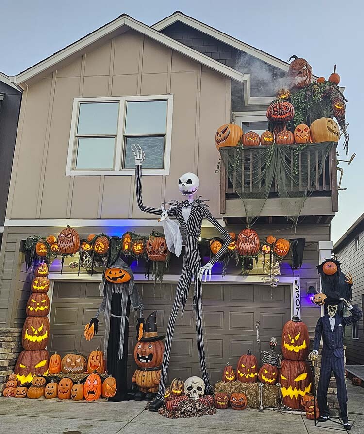He started working on this year’s theme in early August. The props started going up in September. He’s got a Jack from The Nightmare before Christmas, the caretaker from Disney’s The Haunted Mansion, a scarecrow, and, of course, Lewis. Then, high above the balcony, there is a Pumpkin Master, including fog that forms out of his mouth. James made the Pumpkin Master.