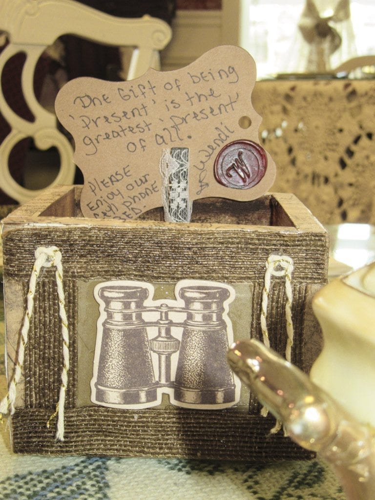On each table in Wendi Deans’s tea shop there’s a cell phone “bed,” with a note inviting readers to let their phones rest, and enjoy the person or people they’re with.