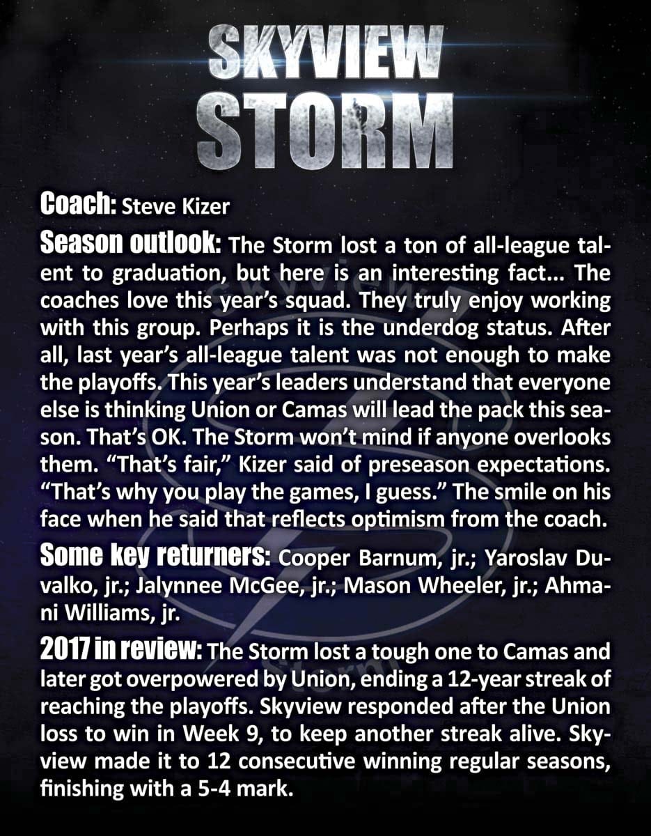 No one at Skyview wants to rely on finishing third, though. Oh, the Storm know that many fans expect this will be Union’s year again. Or Camas might get back on top. The Storm understand the challenge, and they are up to it.