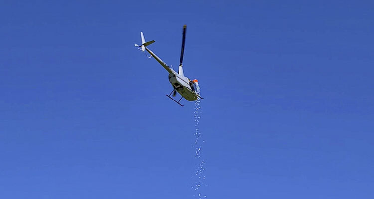 Pilot Darin Graybill of Raven Aircraft, based out of Camas, along with co-pilot Jantzen Filbrun were the centers of attention when they landed on the 18th fairway. They shut down the engine, then loaded up the bucket of golf balls. Filbrun transitioned from co-pilot to ball-dropper when Graybill lifted off with the payload.