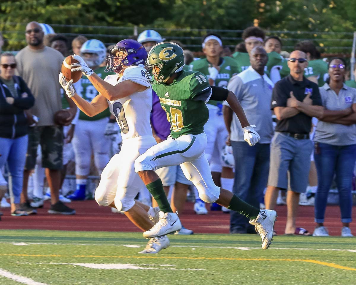 Zyell Griffin had a monster effort for Evergreen, catching three touchdown passes from Carter Monda, including a 99-yarder that tied the game at 28 late in the third quarter. Griffin finished with seven catches for 179 yards.