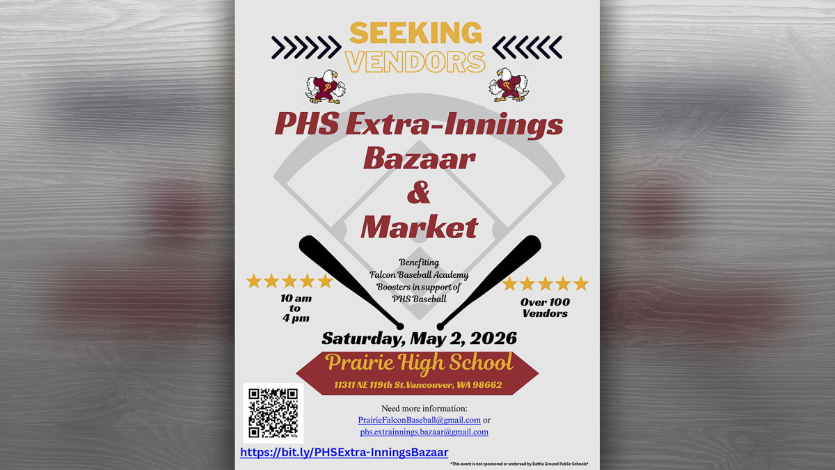 VANCOUVER — The Falcon Baseball Academy, the parent booster club supporting the Prairie High School baseball program, will host the first-ever Extra-Innings Bazaar & Market on Saturday, May 2, 2026, from 10 a.m. to 4 p.m. at Prairie High School, 11500 NE 117th Ave., Vancouver. Vendors are invited to apply to present at the event.