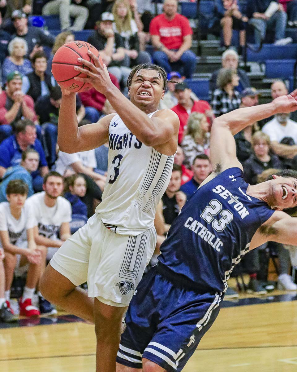 In the girls game, the Knights jumped out to a huge early lead. Seton Catholic rallied to make it a two-point game at one point, but the Knights never lost the lead and won 48-40. Abby Cummins led the team with 15 points. Laurel Quinn added 14 as the Knights improved to 6-2 in league.
