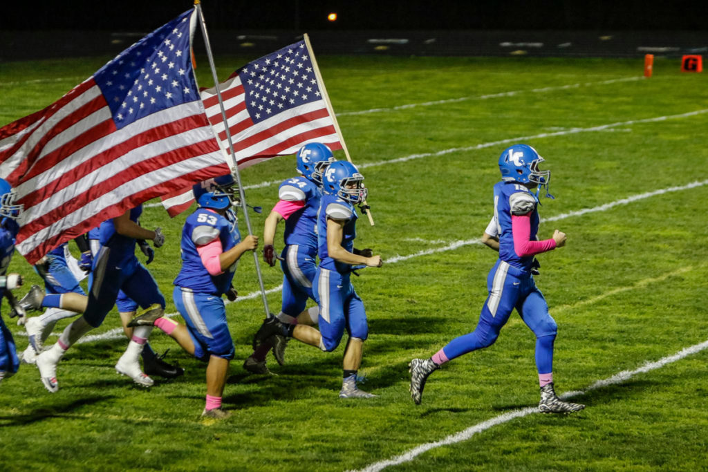La Center football team charges onto the field before a win against Castle Rock Friday at La Center High School. Photo by Mike SchultzLa Center running back Jeffrey Mayolo (34) jumps through an opening in the Castle Rock defense. Photo by Mike SchultzLa Center running back Jeffrey Mayolo (34) runs around the Castle Rock defense. Photo by Mike SchultzLa Center tight end Jackson Leslie (5) catches a pass against Castle Rock defensive back Cole Brister (4). Photo by Mike SchultzLa Center quarterback Jeremy Scott (15) throws a pass against Castle Rock. Photo by Mike SchultzLa Center fullback Isaac Johnson wrestles the ball away from Castle Rock defensive back Nate Myklebust (3) to score a touchdown. Photo by Mike Schultz