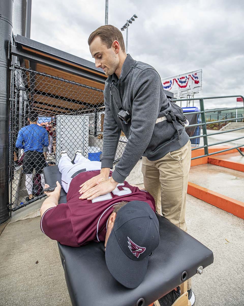 The certified athletic trainer is getting some great experience with a roster of 30-plus college baseball players, each bringing a unique history of ailments, the kind of stuff athletes endure in order to compete.