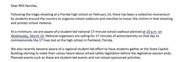 In a letter to parents, Ridgefield High School principal Christen Palmer said they’re aware of the possibility of a walkout, and another regional effort to gather at the state capitol to push for gun reform.