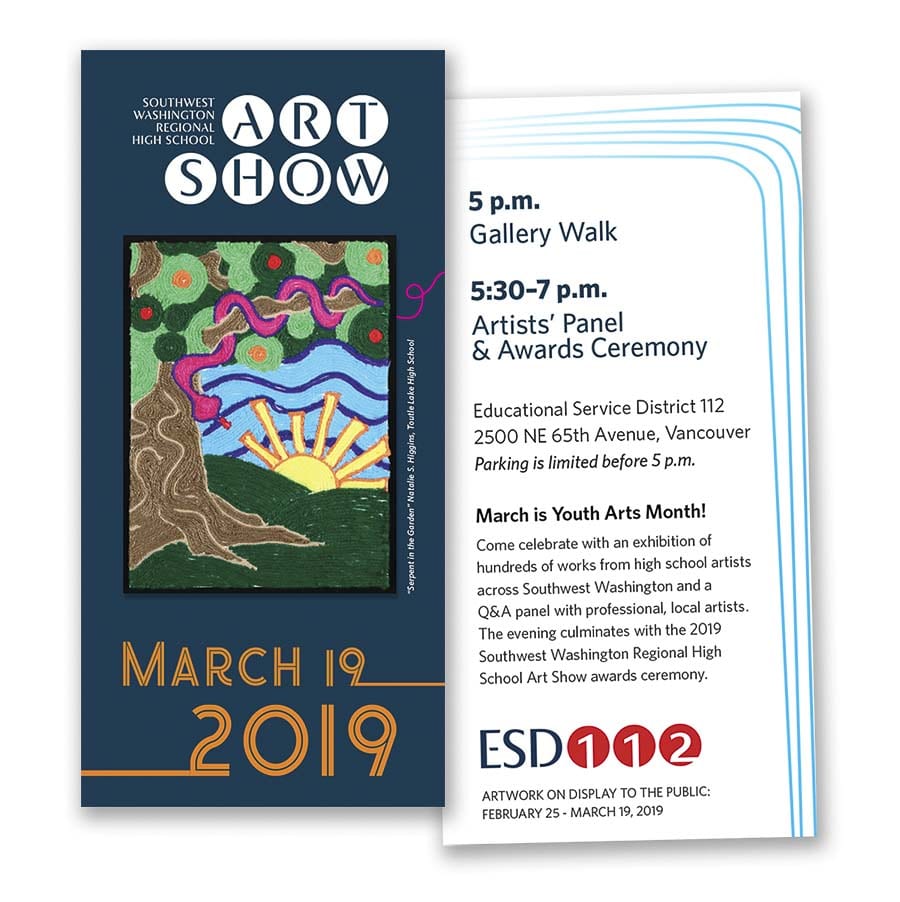 The awards reception will take place Tue., March 19, 5-7 p.m., at ESD 112. The Gallery Walk will open at 5 p.m. and an Artist’s Panel and Awards Ceremony begins at 5:30 p.m.