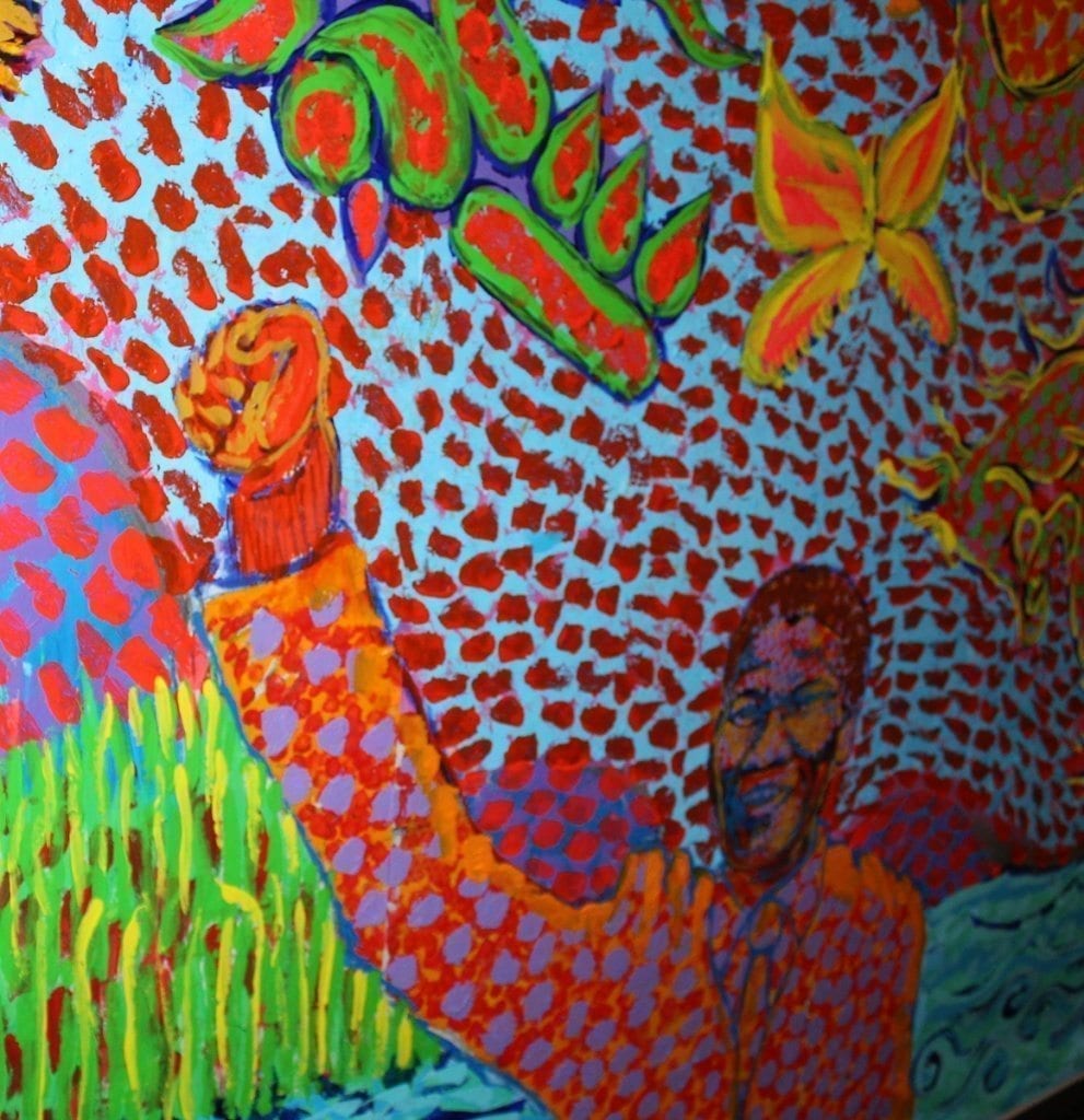 Punctuated by bright splashes of color, the mural features a mix of wild animals, dragons from different cultures and several social justice leaders, some of whom experienced prison first-hand — including Nelson Mandela, the South African anti-apartheid revolutionary who became his country’s first black president in 1994 after serving 27 years in prison, and Cesar Chavez, the labor leader and civil rights activist who co-founded the National Farm Workers Association with activist Dolores Huerta in 1962 and also spent time in jail, in 1970, for refusing to call off a lettuce boycott.