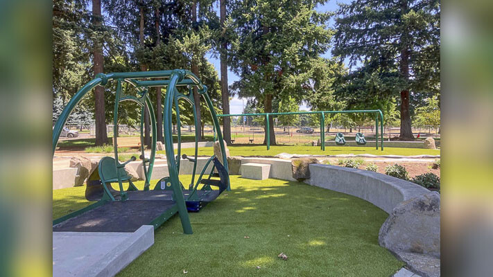 Seeking to increase access to inclusive play spaces within its parks system, the city of Vancouver worked with Harper’s Playground to transform the playground at Marshall Park into a space where people of all ages and abilities will thrive. The site was selected for its existing features of mature fir and cedar trees, community garden, picnic shelter and access to public transit. Marshall Park holds particular significance to the disability community due to its proximity to Marshall Community Center, Luepke Senior Center and Legacy Health’s Pediatric Rehabilitation Center, which provides physical therapy to hundreds of youths with physical disabilities.