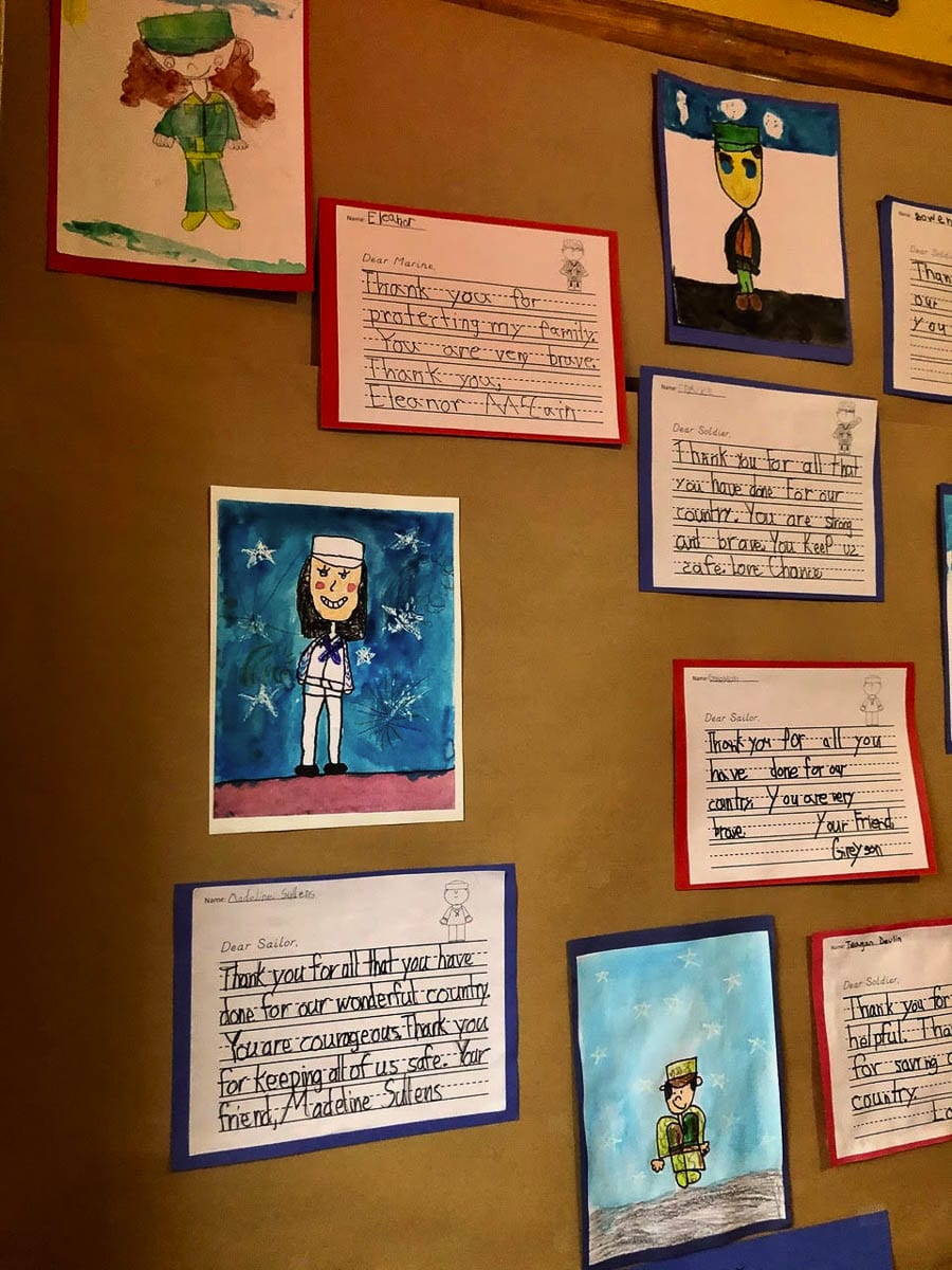 Union Ridge Elementary created a video showing the military family members of students. Some families had many generations of military service. Students also created original artwork to display at Seasons Coffee Shop, where an entire wall was covered with drawings to thank veterans for their military service.