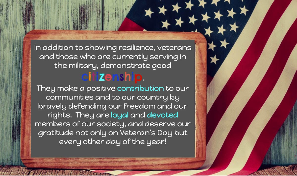 South Ridge Elementary designed a slideshow to educate students on the meaning of Veterans Day. It included lessons on Veterans Day, the colors in the American flag, and citizenship. And it tied the lessons back to their character trait lesson for October, which was resilience. They also included photos of family members in military service.