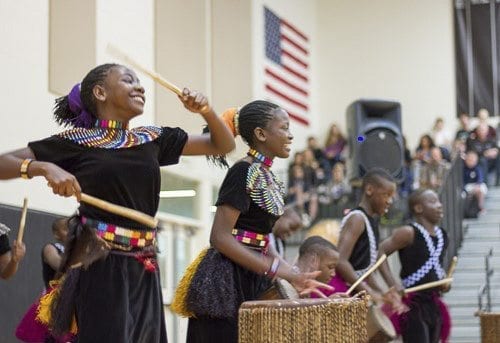 During their concert at Woodland High School, the young musicians, ranging in age from 13 to 16 years old, performed songs and dances from some of the more than 50 tribes and cultures in Uganda. The choir started their performance by singing a special African-inspired rendition of the American National Anthem. The student performers played a variety of musical instruments including drums and tambourines, and performed nearly-acrobatic stunts like kicks, flips, and splits all while maintaining the songs’ rhythm. In between songs, one of the directors addressed the high school audience, and taught them about the organization’s mission and the purpose of the choir to help raise awareness of the challenges facing Ugandan children.