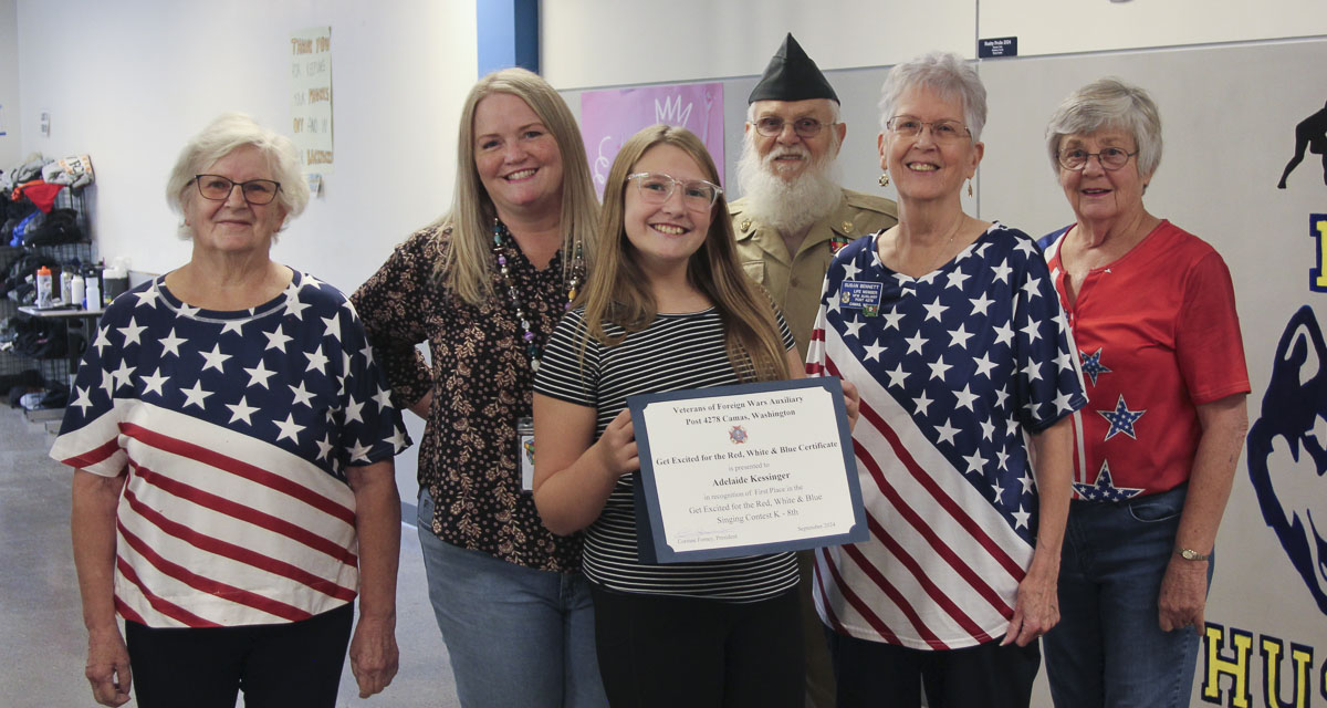 VFW Auxiliary Historian/Media Relations chair Susan Bennett, who helped present the awards, said, “We are always so impressed by the art, singing, and essays that Camas and Washougal students submit. Members of the Auxiliary and VFW Post 4278 are excited to use these contests to encourage students to learn about our country and our democratic values. We encourage all students, including those who are not enrolled in art or music classes, to enter the contests.”